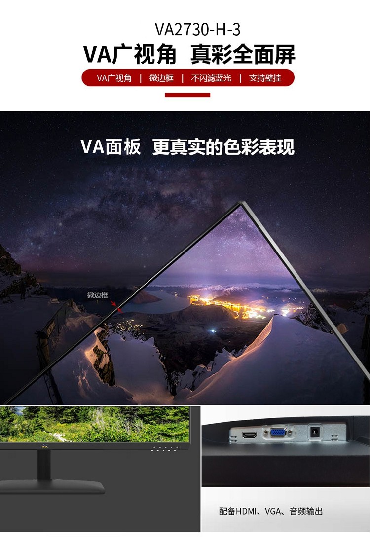 优派(ViewSonic)VA2730-H-3 27英寸广视角电脑显示屏 75Hz 爱眼低蓝光 窄边框